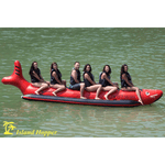 Island Hopper™ 1100 denier "Heavy Commercial" Banana water sleds are carefully hand crafted using reinforced 1100 denier, UV resistant PVC material. This is a dense puncture resistant material, commonly used in the manufacture of high quality white water boats. Each sled is hand made using glue bonded overlapping seams and are double reinforced in the high stress - hard use areas. Thousands of these durable banana boats have been sold to camps, commercial beach operations and resorts worldwide.